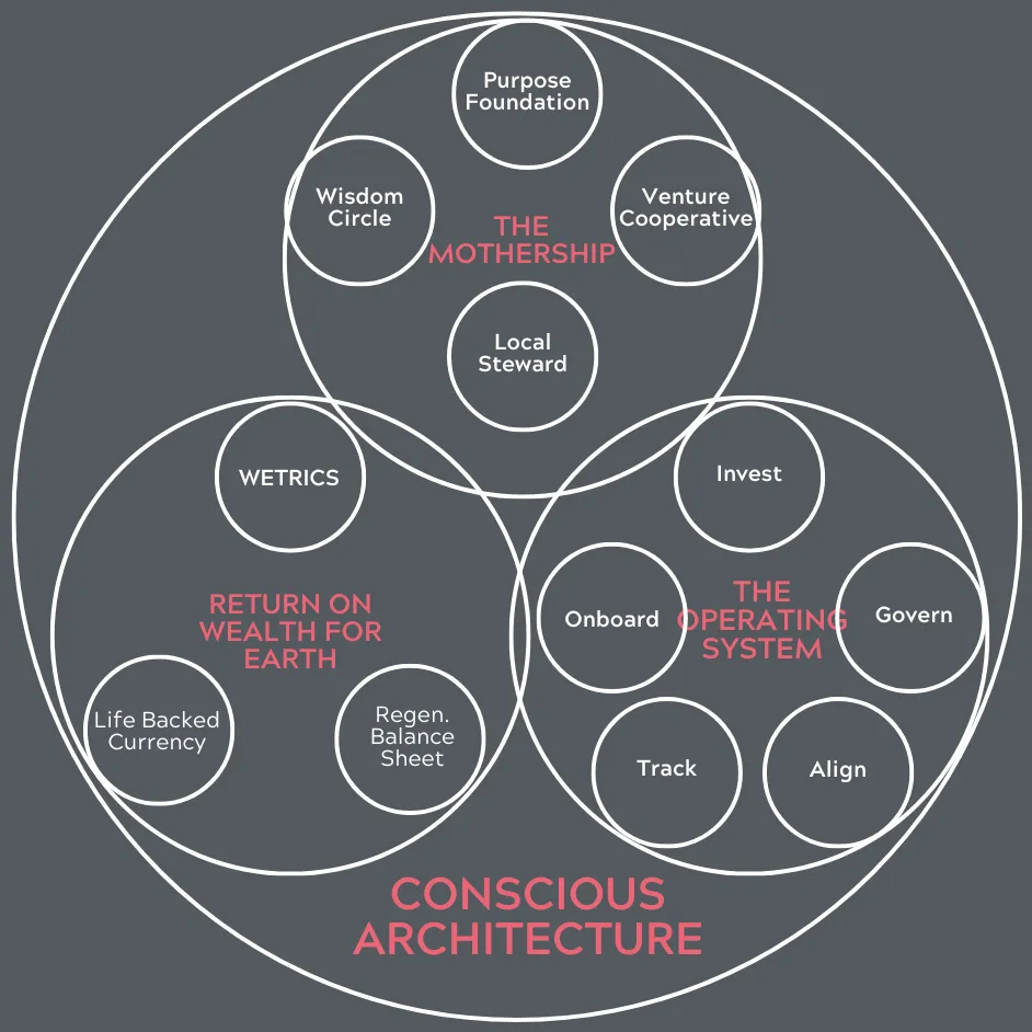 The Mothership — Four-layer legal architecture. Purpose Foundation (eternal steward), Venture Cooperative (operating builder), Wisdom Circle (strategic governance), Local Stewardship (operational sovereignty). A structure that cannot be captured.